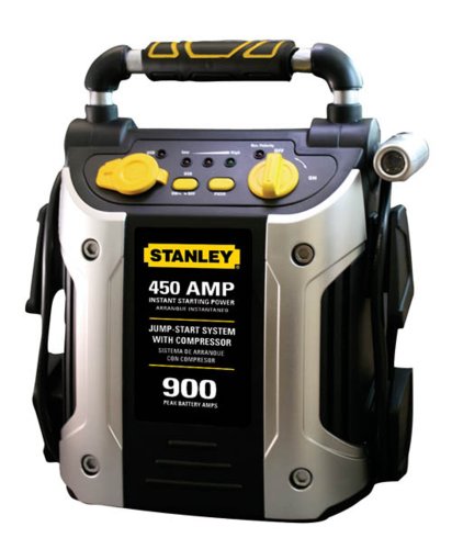 Stanley 450 Amp Jumper with Compressor has 450 amps of instant starting power, with 900 peak amps of power. It includes a 120 PSI compressor, DC charging plug, heavy duty metal clamps, AWG cables and a high powered LED light that rotates 270 degrees. This starter features a reverse polarity alarm for safety along with a metal handle grip and impact resistant injection molded housing. It consists of a power or charge indicator and reverses polarity alarm.